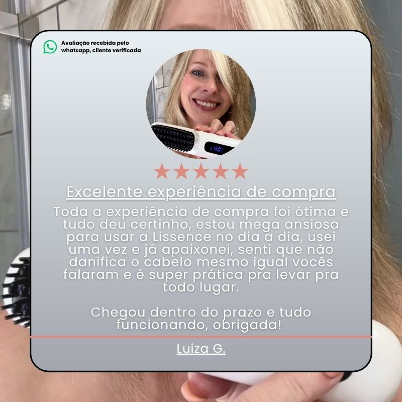 A Escova Lissence Pro Cortezzo foi desenvolvida para quem busca praticidade, eficiência e cabelos impecáveis em qualquer momento do dia. Com design moderno, tecnologia de íons negativos e bateria de longa duração, ela entrega resultados de salão sem precisar de fios, tomadas ou longas horas na frente do espelho.