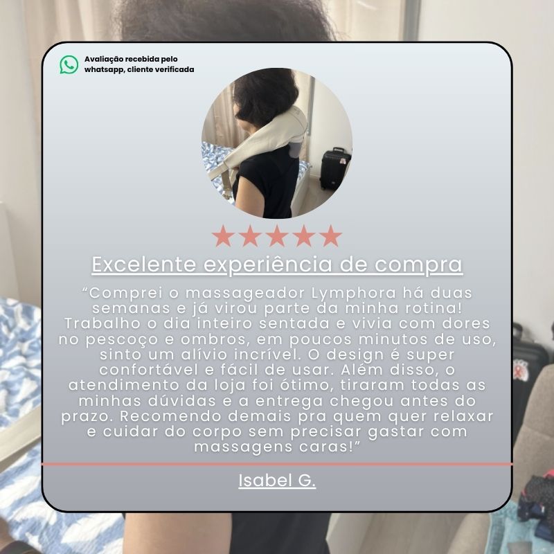 Com o Massageador Lymphora, você terá relaxamento e alívio muscular profissionais, economizando tempo e dinheiro com terapias externas. Experimente massagem profunda e conforto sempre que quiser — o cuidado que seu corpo merece, em suas mãos.